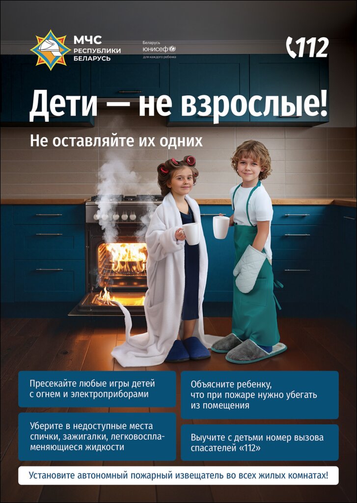 Чтобы привлечь внимание родителей к существующей социальной проблеме Научно-исследовательским институтом пожарной безопасности и проблем чрезвычайных ситуаций МЧС Беларуси при поддержке Представительства Детского Фонда ООН (ЮНИСЕФ) в Республике Беларусь разработана новая информационная кампания «Дети – не взрослые! Не оставляйте их одних!», реализация которой станет новым подходом в решении этой непростой задачи.